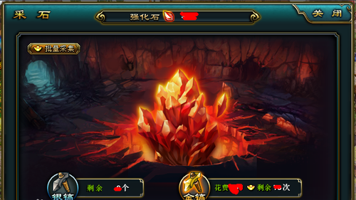 金镐:使用金镐需要花费一定金币, 金镐采集可固定获得得大量强化石资源,不同VIP等级可进行采集次数不同。