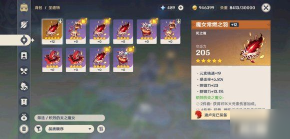 并且优先目标是刷4星暴击头爆伤头以及对应属性伤害杯子,五星随缘。这里用带闸里日月的可莉举例子,可以选择2攻击+2魔女的组合,武器有暴击