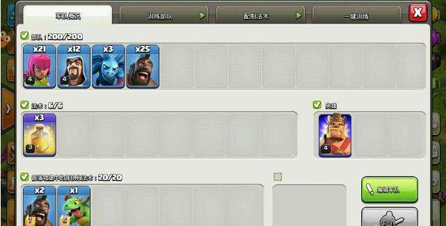 现在给大家看看配兵图,25只野猪为主攻击,法师加弓箭还有亡灵是引援,杀蛮王和收尾用的。千万记住,要留三只亡灵收尾,弓箭和法师都用完没事。如果在引完援兵还有剩弓箭或法师,就看看蛮王有没有在外面。能杀蛮王尽量杀,因为蛮王会对野猪造成高额输出。援兵有野猪带野猪,我部落的人给了我龙宝加野猪。