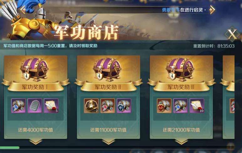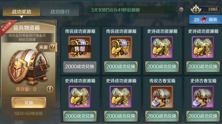 获取的战功可以在战功奖励中换取征兵包、资源宝箱和古卷宝箱。每周通过宝石刷新,一共可以换取两轮的宝箱。