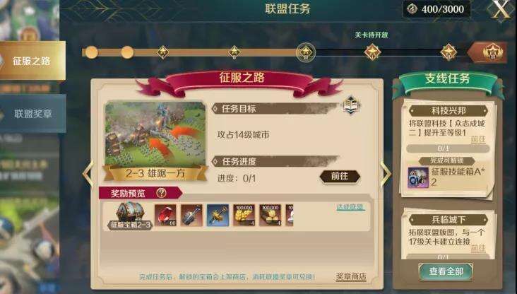 征服之路主要指引联盟的玩家攻打城池,获取丰富节点奖励,包括宝石、基础资源、装备等等。限时完成节点任务的联盟还会有额外奖励,包括更多的宝石、将魂魂碑以及英雄徽章。