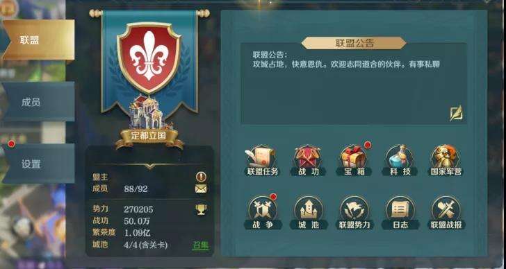联盟,不但可以为成员提供宝石和基础资源等奖励,加快大家繁荣度和领主评分的提升,而且让我们凝聚在一起,为城池的攻占以及以后出关的国战奠定基础。