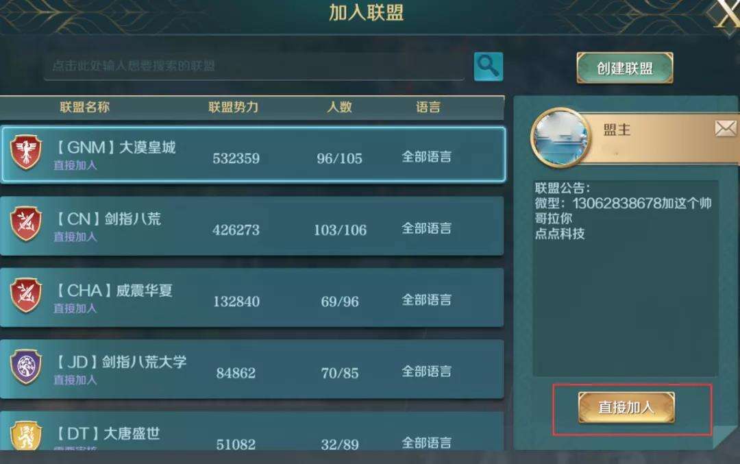 点击加入联盟进入选择联盟界面