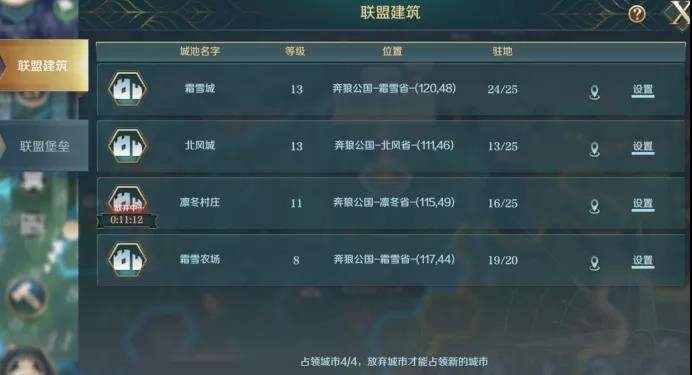 联盟占领的城池和拥有的战争堡垒都在在城池页面中显示 。