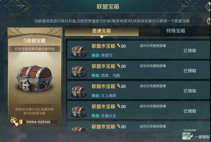 联盟成员在累充、购买限时礼包以及讨伐黑鸦营寨后,全员都可以在这个界面领取宝箱奖励。领取宝箱还会积累宝箱点,用来开启联盟宝藏 。
