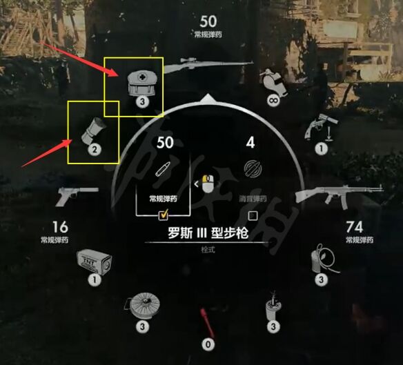 打开武器轮盘(长按Q键),可以确认口袋中有多少个医疗包和绷带。