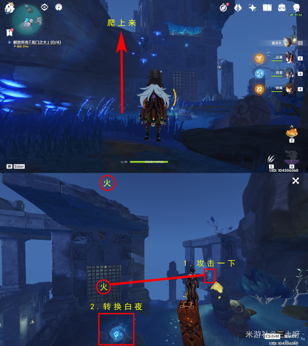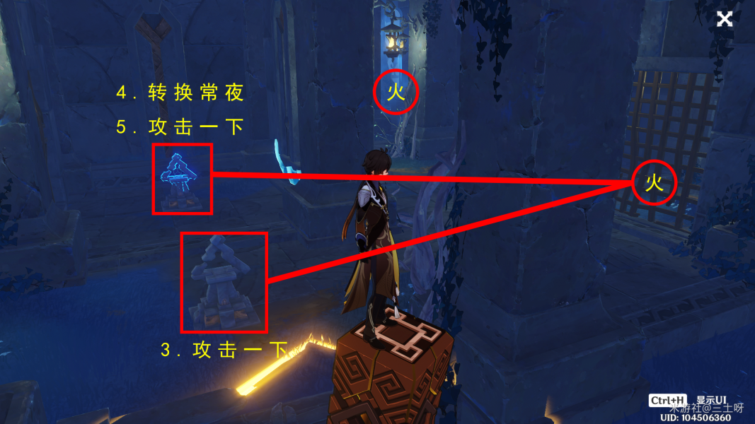 2.牢笼里的高门之火,攻击外面的三角机关,然后转换常夜,再攻击里面的三角机关进入