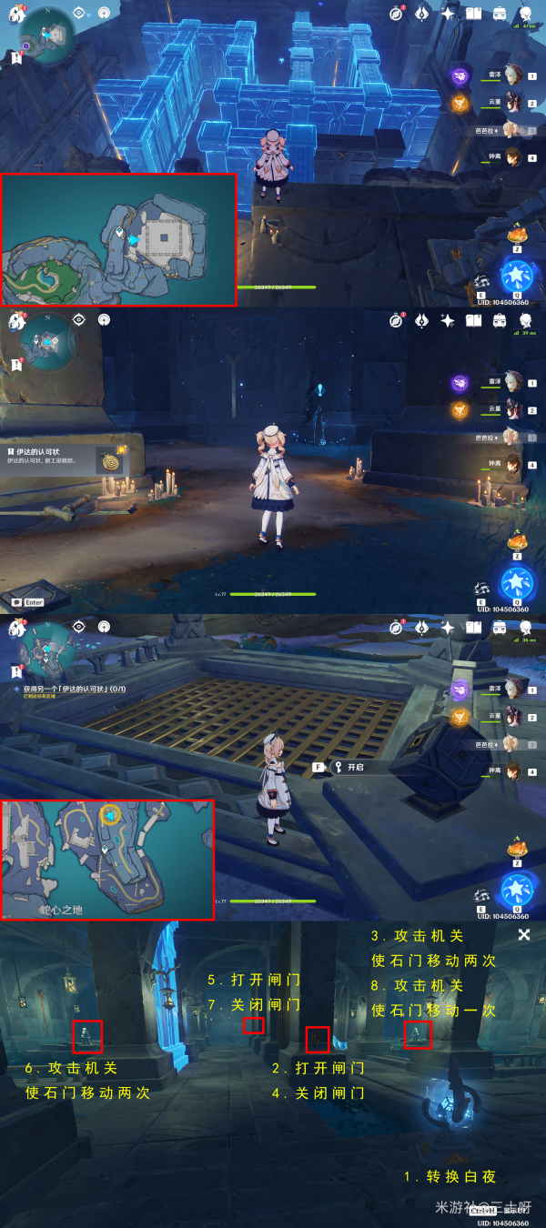 来到下图的地方完成解谜,初始状态下,在「白夜」时,攻击旁边两个机关各一次,然后下去激活四个水元素方碑