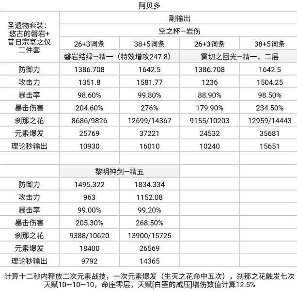 计算中技能释放方式略倾向于混伤阿贝多,对于长时间后台的输出方式,磐岩结绿与雾切之回光的优势会降低。