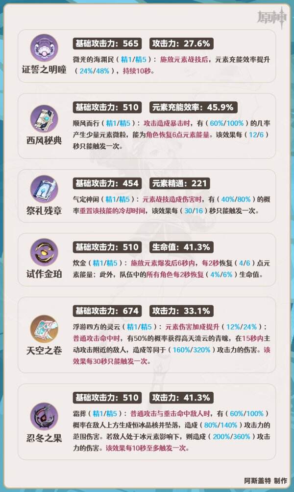 证誓之明瞳:施放战技后提高夏洛蒂的充能效率,优化元素爆发循环,并且武器副属性可提供额外攻击力提升,提高夏洛蒂的治疗量。治疗辅助玩法优先考虑的几把法器之一。