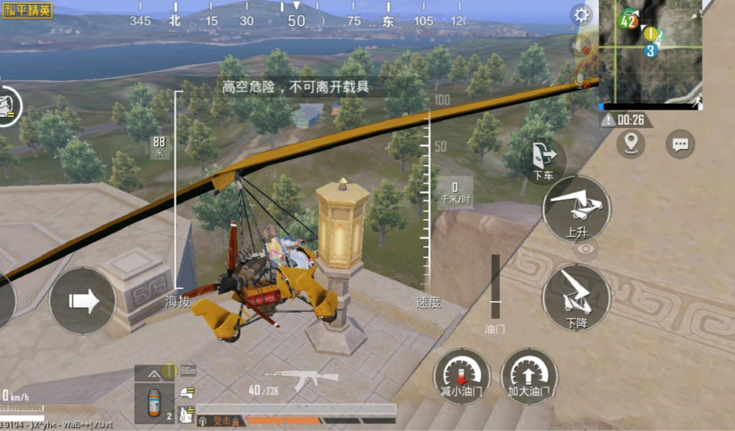 如图,当玩家乘坐滑翔机来到祭坛时,出现了“高空危险,不要离开车辆”的提示,玩家别无选择,只能原地等待信号圈的消除,最终因为信号圈而被消除。